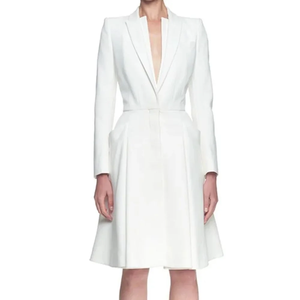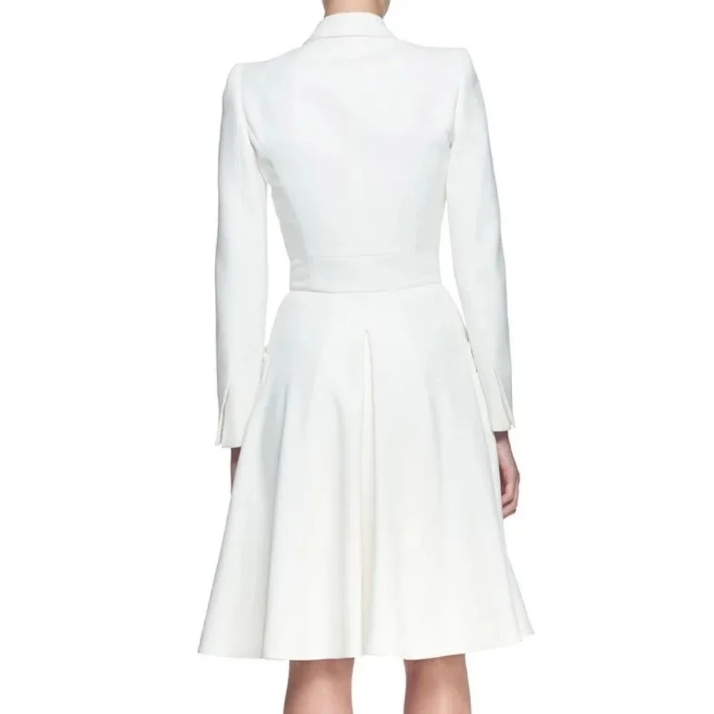 For dry cleaning only to preserve the crisp white color, fabric quality and structured shape of the coat dress.